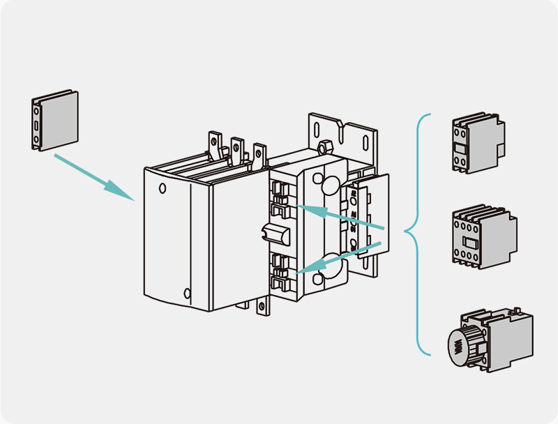 NYKC series accessories adopt modular design. Auxiliary contacts on the top or the side, air delay head, surge suppressor and other accessories can be installed on the product; create the combination of products in the way of stacking blocks enabling more complex control functions and a wider range of applications.