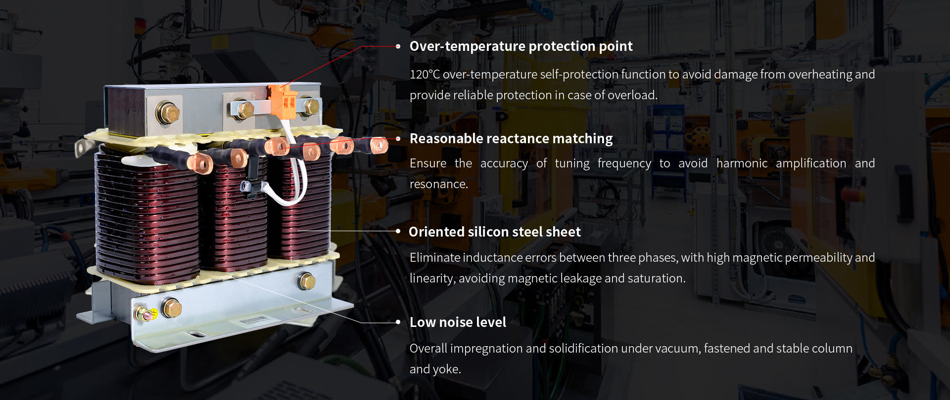 In the production process, products are impregnated and solidified under vacuum to avoid the impact of water molecule on the performance and service life of reactor. Each reactor is equipped with an over-temperature protection point for the customer to ensure that the linkage switch can be quickly and reliably cut off under abnormal conditions.