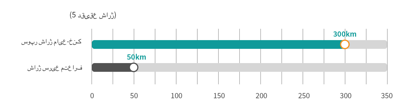 توان شارژ ترمینال سوپرشارژ مایع خنک DC به 600kW می رسد، و فناوری اتلاف حرارت با مایع خنک با تنظیم هوشمند، نیازهای اتلاف حرارت کابل را زمانی که جریان 600A است برآورده می‌کند. می‌تواند فرآیند تکمیل انرژی را با عمر باتری 300+km پس از 5 دقیقه شارژ کامل نماید، تجربه ی شارژی را خواهید داشت که گویی با بنزین سوختگیری می کنید و نیازهای شارژ سریع را به حداکثر می‌رساند.