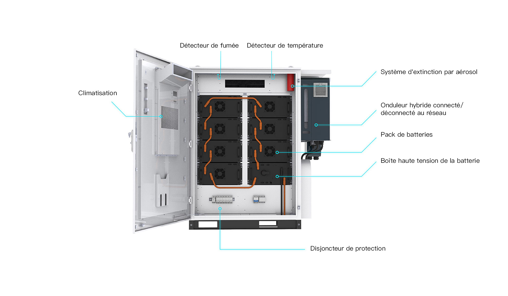 Batterie au lithium fer phosphate (LFP) sans cobalt, conception de sécurité incendie à trois niveaux avec PACK+système+isolation thermique, protection par relais indépendante, surveillance thermique au niveau des cellules, isolation physique des défaillances ponctuelles, améliorant considérablement la sécurité du système.