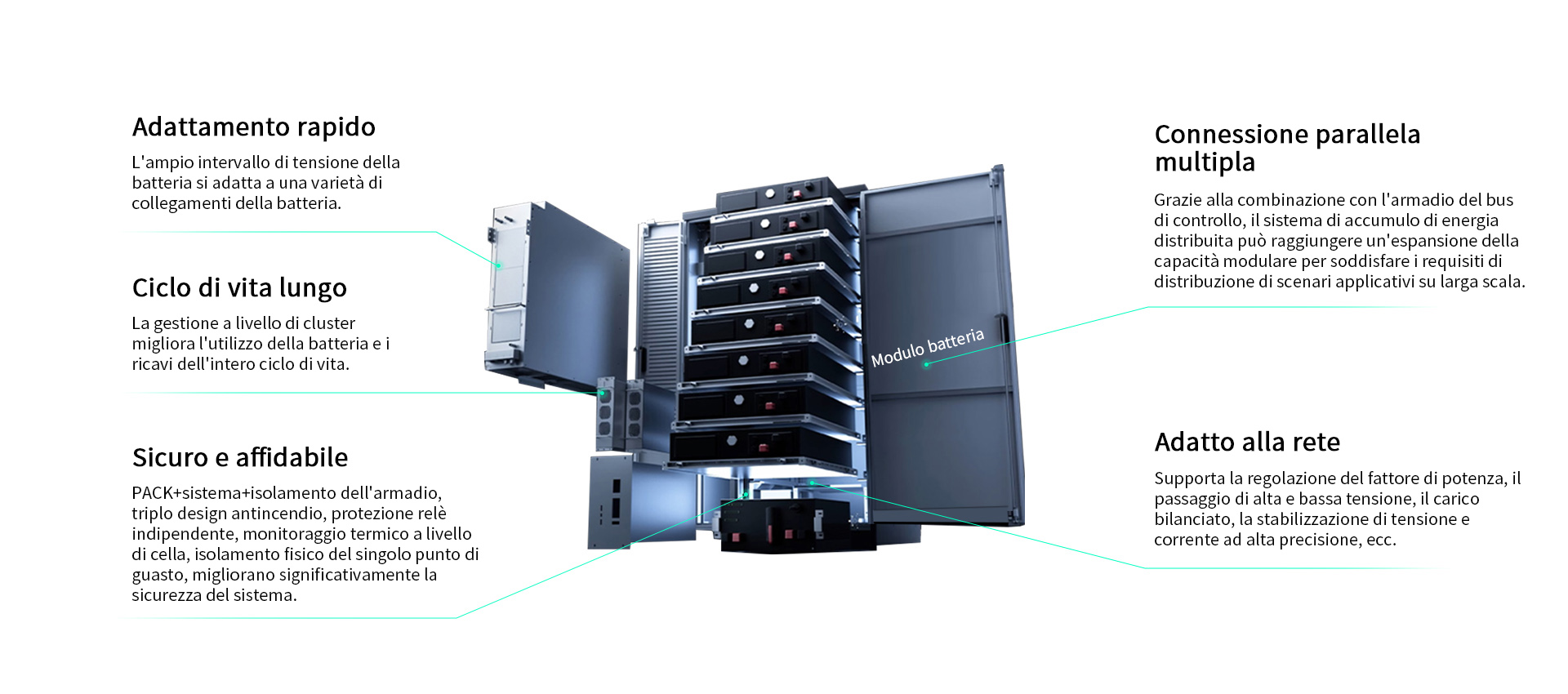 L'ACCUMULO di energia distribuito in parallelo con più macchine può soddisfare le esigenze delle centrali elettriche di ACCUMULO di energia a livello di megawatt. I sistemi a stringhe sono più efficienti e sicuri e hanno costi di implementazione in loco inferiori.