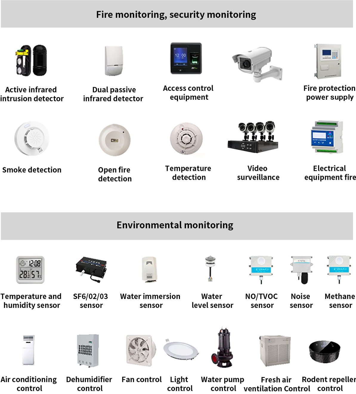 Optional comprehensive environmental testing and pre-alarms of temperature and humidity, smoke detection, water immersion, infrared detection, partial discharge, harmful gases, access control, video and other factors.