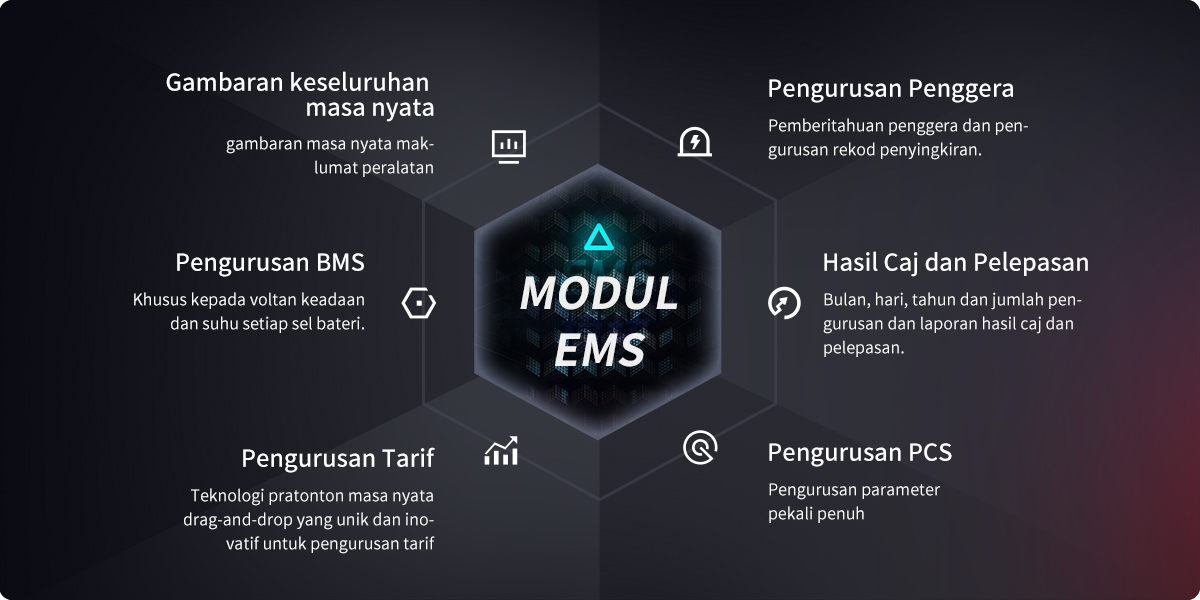 Gambaran keseluruhan masa nyata maklumat peralatan, kawalan parameter yang dikeluarkan dalam beberapa saat, pemberitahuan penggera dan penghapusan pengurusan rekod, statistik laporan kos, pertanyaan data sejarah yang tepat, teknologi pratonton masa nyata seret dan lepas yang eksklusif dan inovatif pengurusan tarif masa wilayah, Pengurusan parameter seluruh sistem PCS, pengurusan BMS boleh khusus kepada keadaan setiap voltan dan suhu sel bateri, jumlah pengecasan dan penyaluran harian-bulanan-tahunan pengurusan dan pelaporan, kabinet penyimpanan modul pemadam api Kawalan, meter penyaman udara pemeteran tepat kawalan, dengan mod penyewa, boleh mengurus, berbilang sub-akaun ejen bawahan baharu, dan mencipta stesen janakuasa EMS sub-akaun.