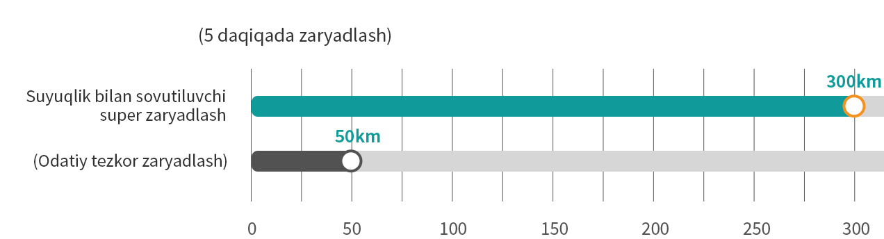 O‘zgarmas tokli suyuqlik bilan sovutiluvchi super zaryadlash terminalining zaryadlash quvvati 600 kVt ga yetadi va aqlli sozlangan suyuqlik bilan sovutiluvchi issiqlik tarqalish texnologiyasi tok kuchi 600 A bo‘lganda kabelning issiqlik tarqalishi talablariga javob beradi. U 5 daqiqa davomida zaryadlangandan keyin 300+km batareya quvvati bilan energiyani to‘ldirish jarayonini yakunlashi mumkin, xuddi benzin yoqilg‘isiga o‘xshagan zaryadlash tajribasini olib keladi va super tez zaryadlash ehtiyojlarini maksimal darajada qondiradi.