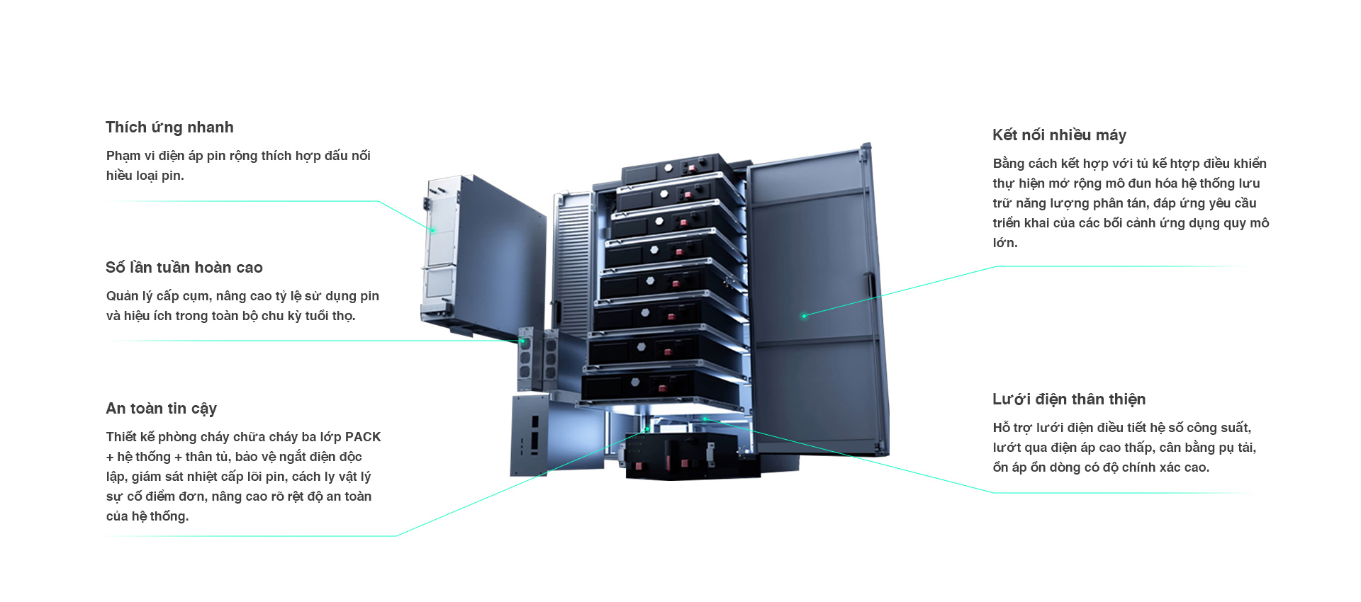 Ghép nhiều máy lưu trữ năng lượng dạng hân bố có thể đáp ứng yêu cầu trạm điện lưu trữ năng lượng cấp megawatt, hệ thống dạng chuỗi có hiệu suất và độ an toàn cao hơn, giảm chi phí triển khai tại chỗ.