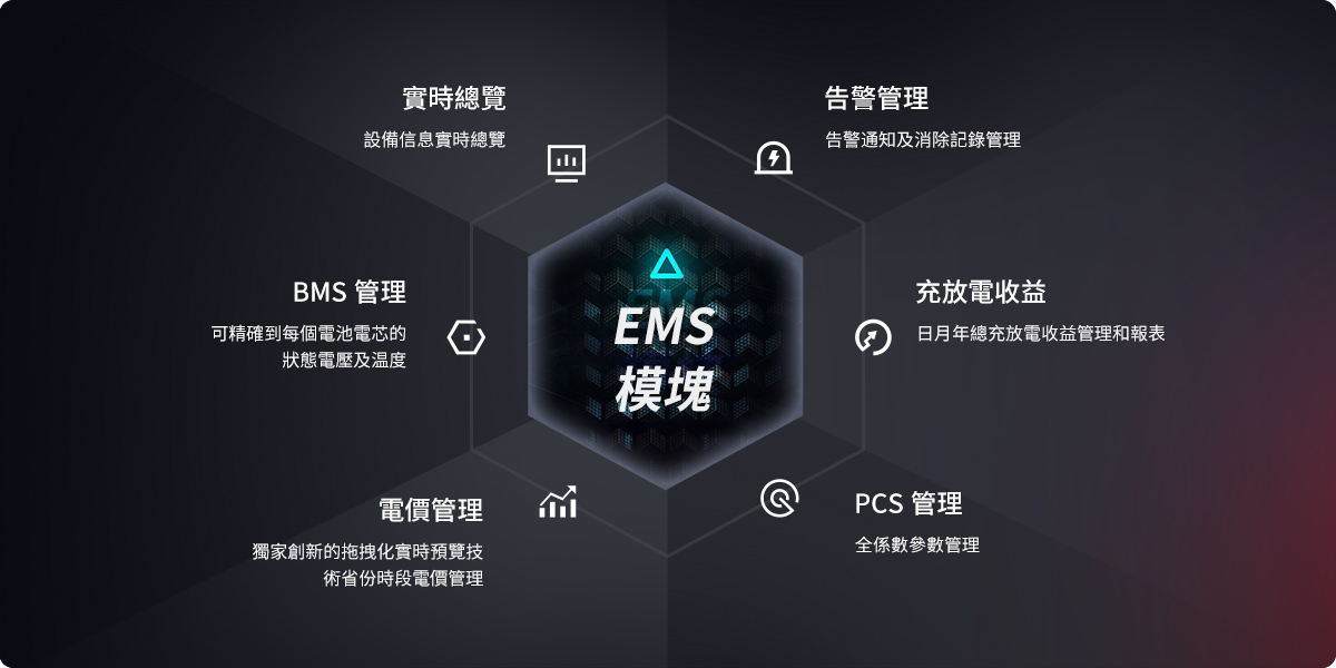 設備信息實時總覽、參數控制秒級下發、告警通知及消除記錄管理、費用報表統計、歷史數據精準查詢、獨家創新的拖拽化實時預覽技術省份時段電價管理、PCS全系統參數管理、BMS管理可精確到每個電池電芯的狀態電壓及温度、日月年總充放電收益管理和報表、儲能櫃滅火消防模塊控制、空調電錶精準計量控制、擁有租户模式,可管理、新建多個下屬代理子賬號,並創建子賬號EMS電站。