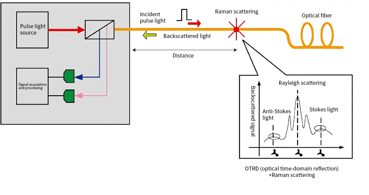 分布式光纤在线温度监测是用于实时测量空间温度场的传感系统,在系统中光纤既是传输媒体也是传感媒体。利用光纤的拉曼光谱效应,光纤所处空间各点温度场调制了光纤中传输的光载波,经解调后实时地显示光纤所在空间的温度值,利用光时域反射(OTDR)技术,由光纤中的光传播速度和背向光回波时间,能对所测各温度点定位(类似于光雷达系统)。