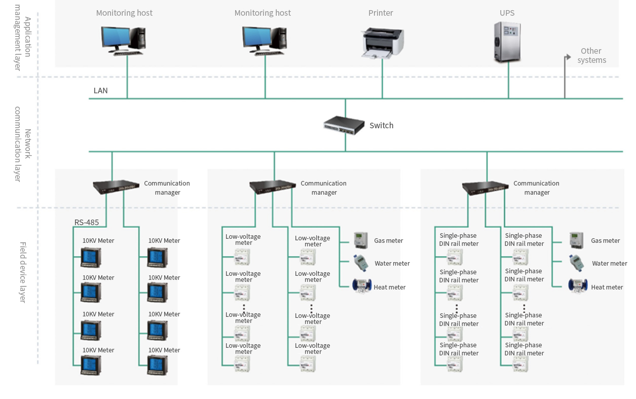 设备层:主要用于现场供配电设备数据、状态信号的采集和控制。设备层由监测系统所使用的各类高压/低压电表气表、水表、热力表等智能终端组成。
